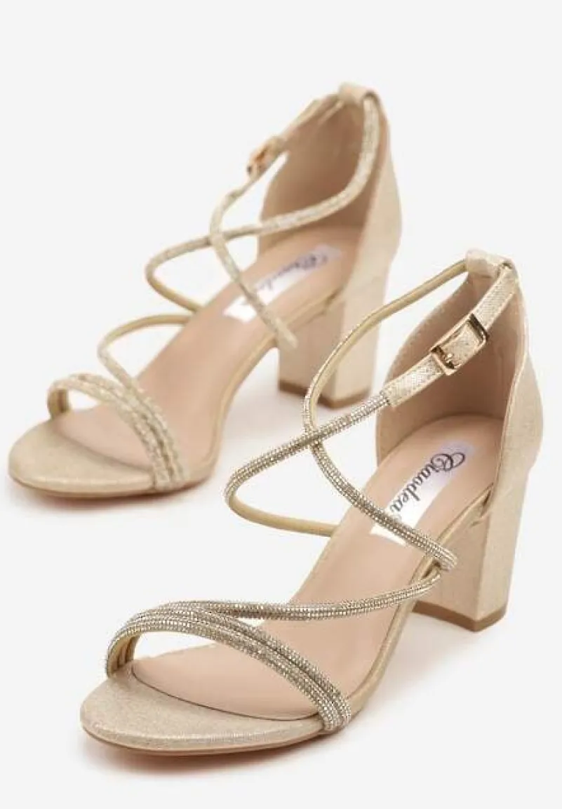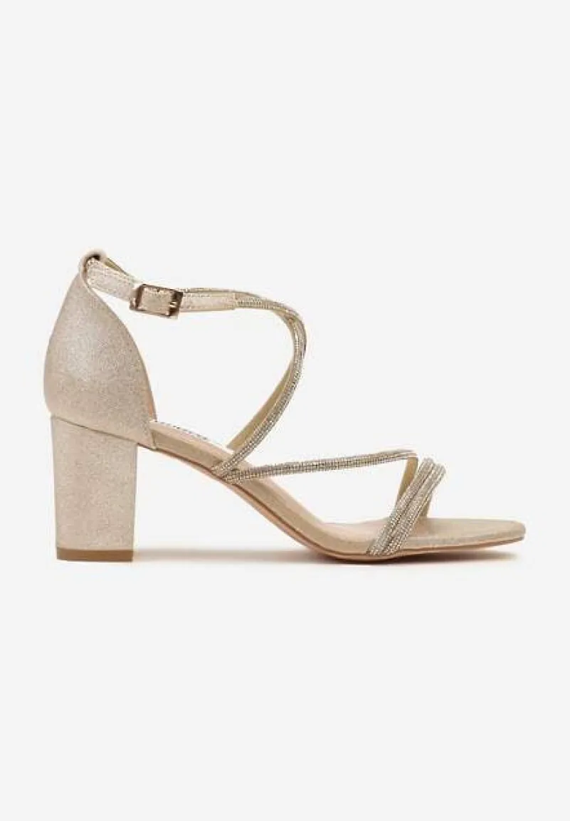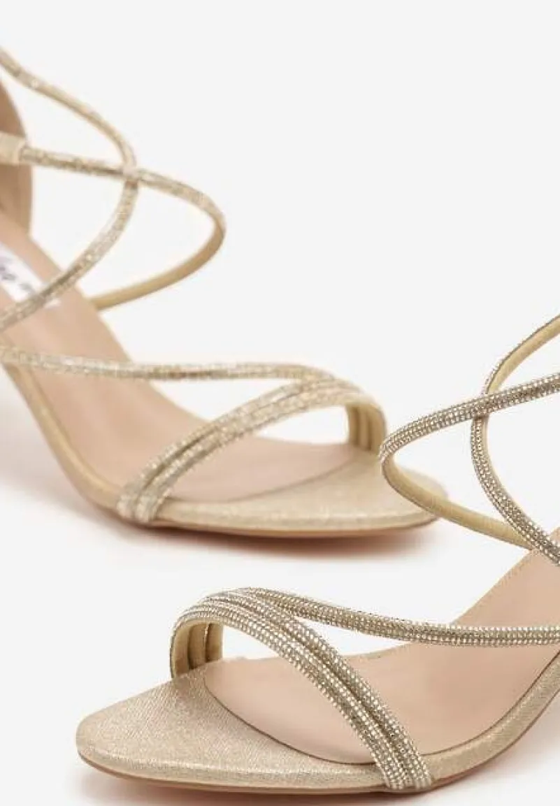 Złote Sandały na Słupku z Cyrkoniami i Brokatem Silanelle