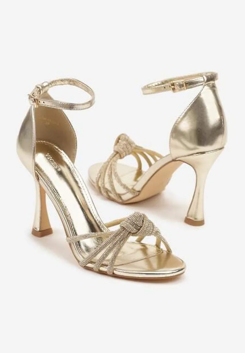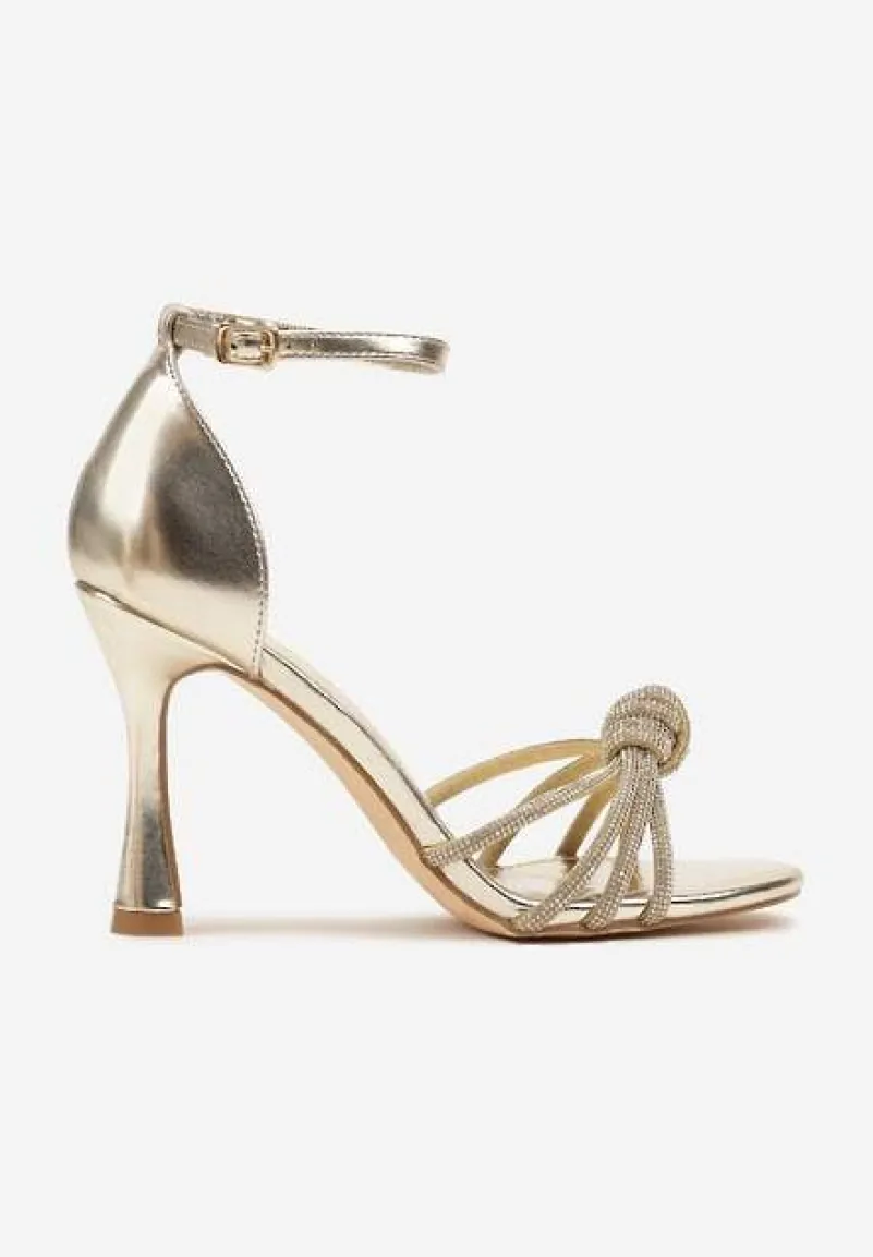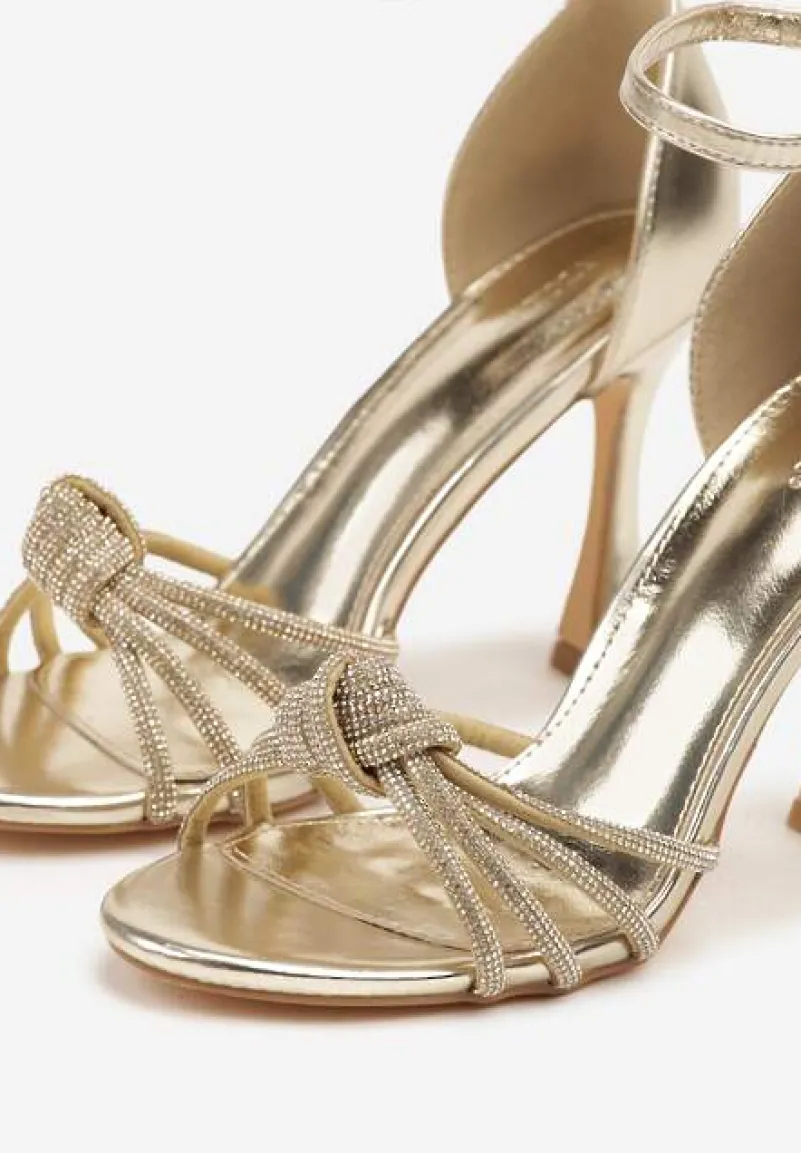 Złote Sandały na Szpilce Vices z Supełkiem i Cyrkoniami Tallomea