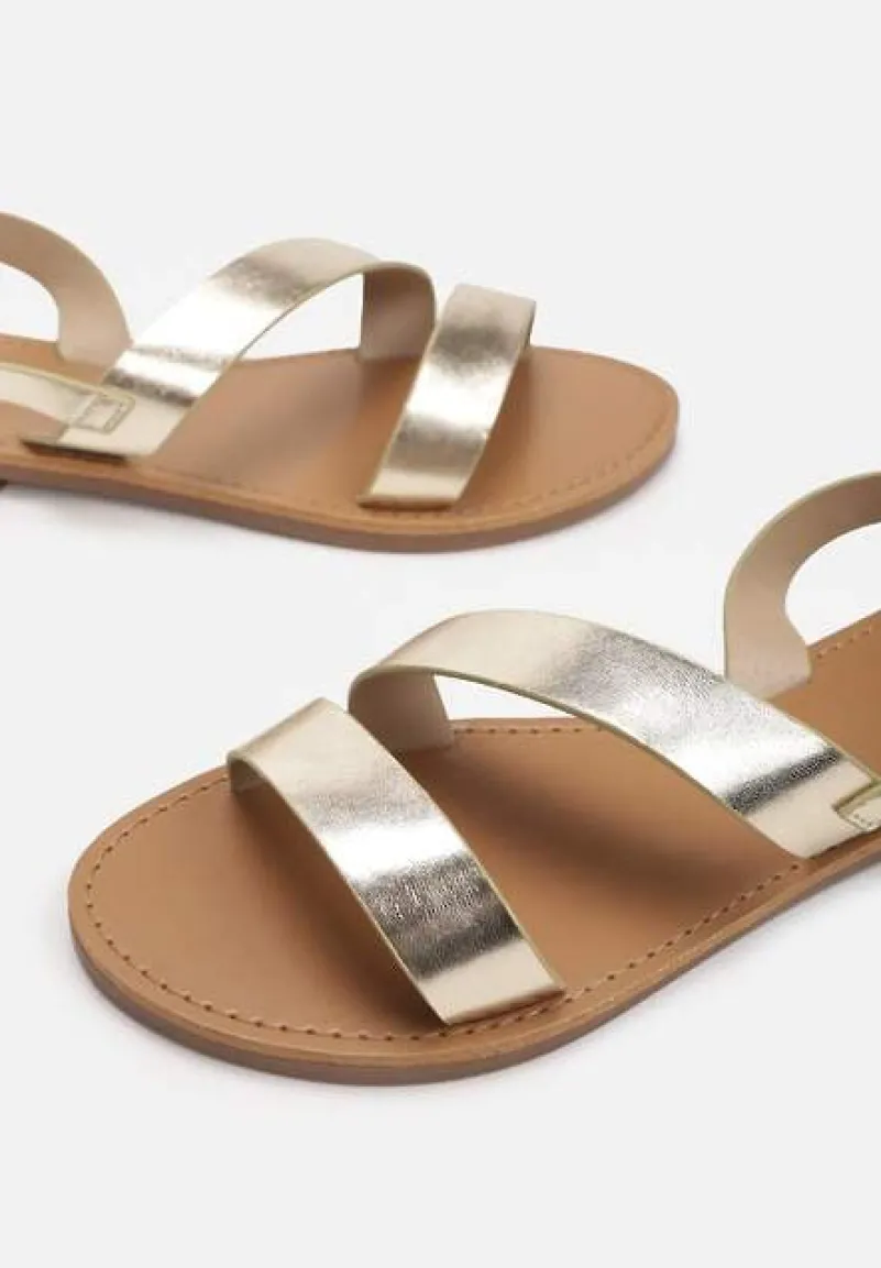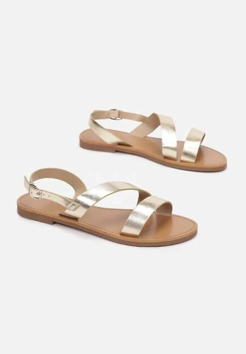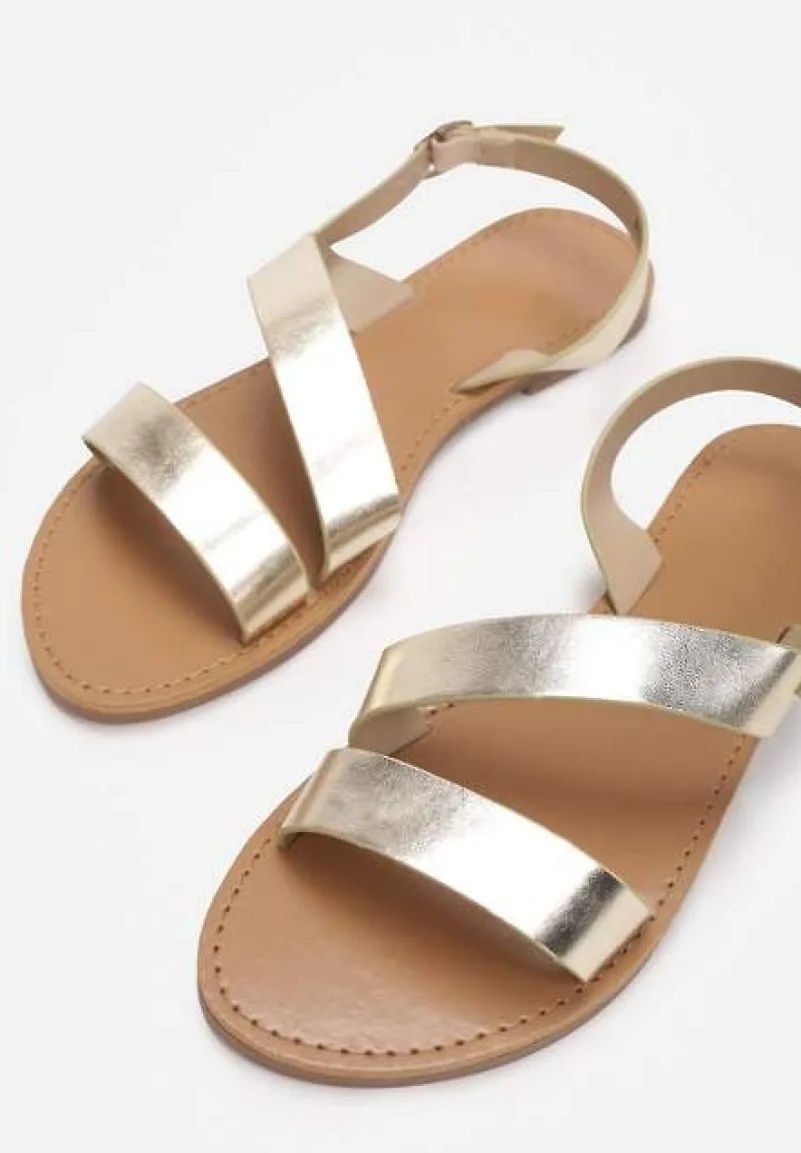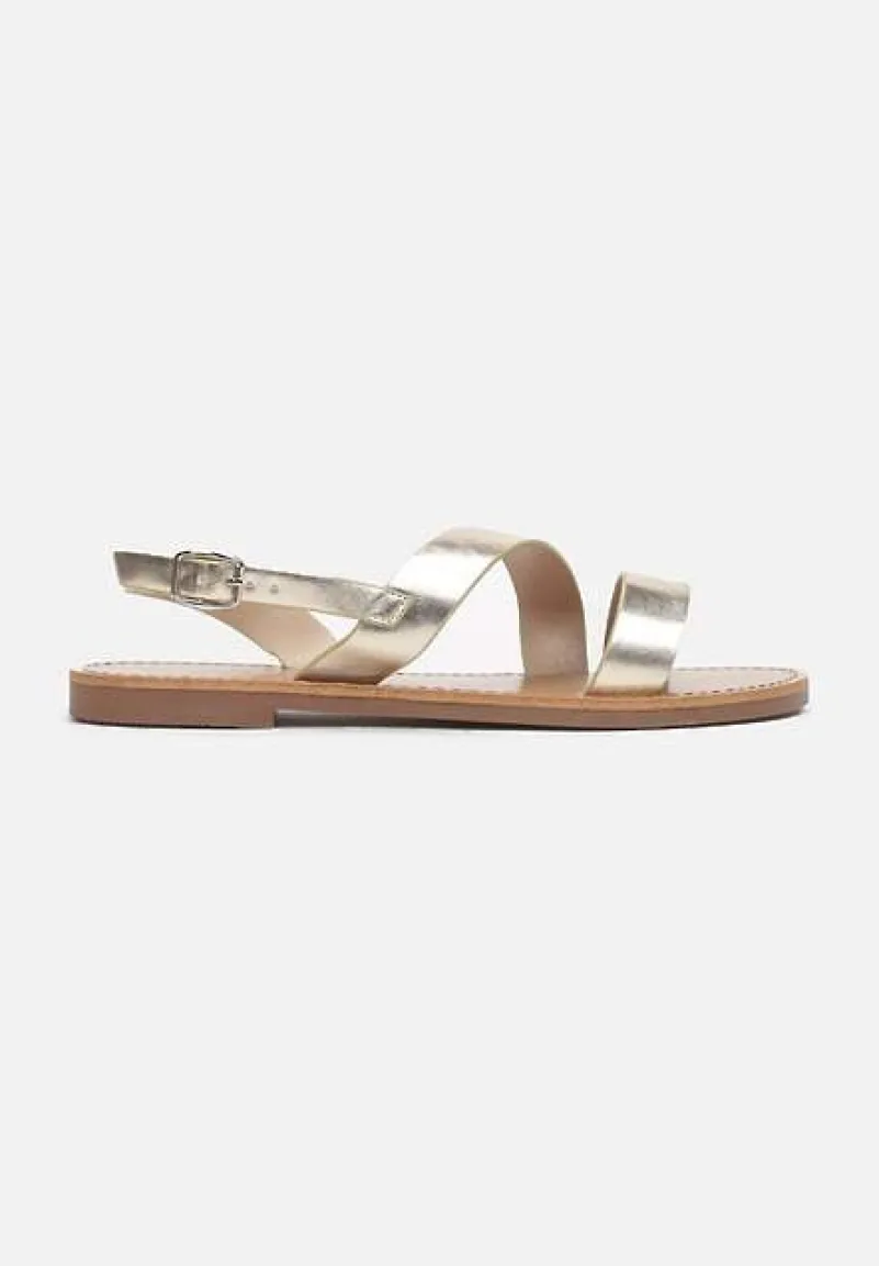 Sandały Psaloche z zapięciem na metalową sprzączkę. Osadzone na płaskiej podeszwie. Z okrągłym noskiem odkrywającym palce oraz z otwartą piętą. Wykonane z ekoskóry w jednolitym kolorze. Wąskie, będą najlepiej leżeć na smukłej stopie. Noś je np. do luźnych szortów przed kolano i koszulki z kwadratowym dekoltem.