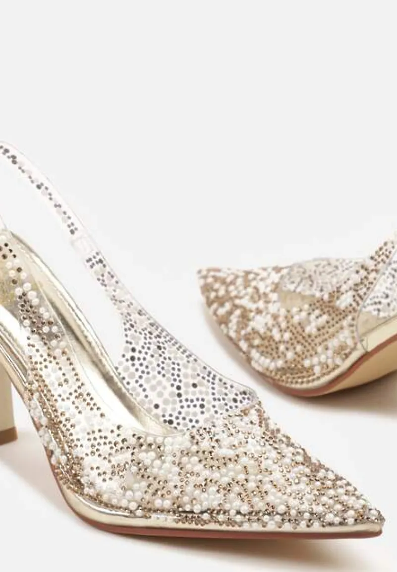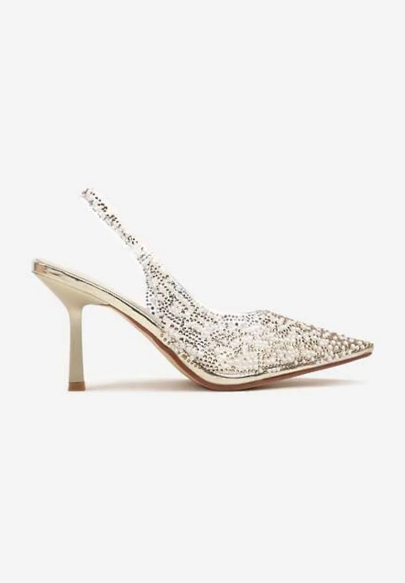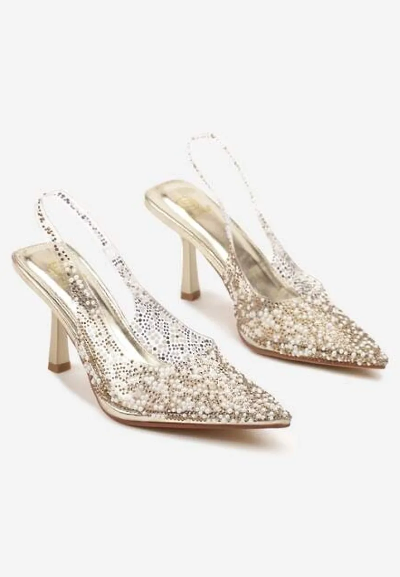 Złote Sandały Szpilki z Odsłoniętą Piętą Ozdobione Cyrkoniami i Perłami Nelionna