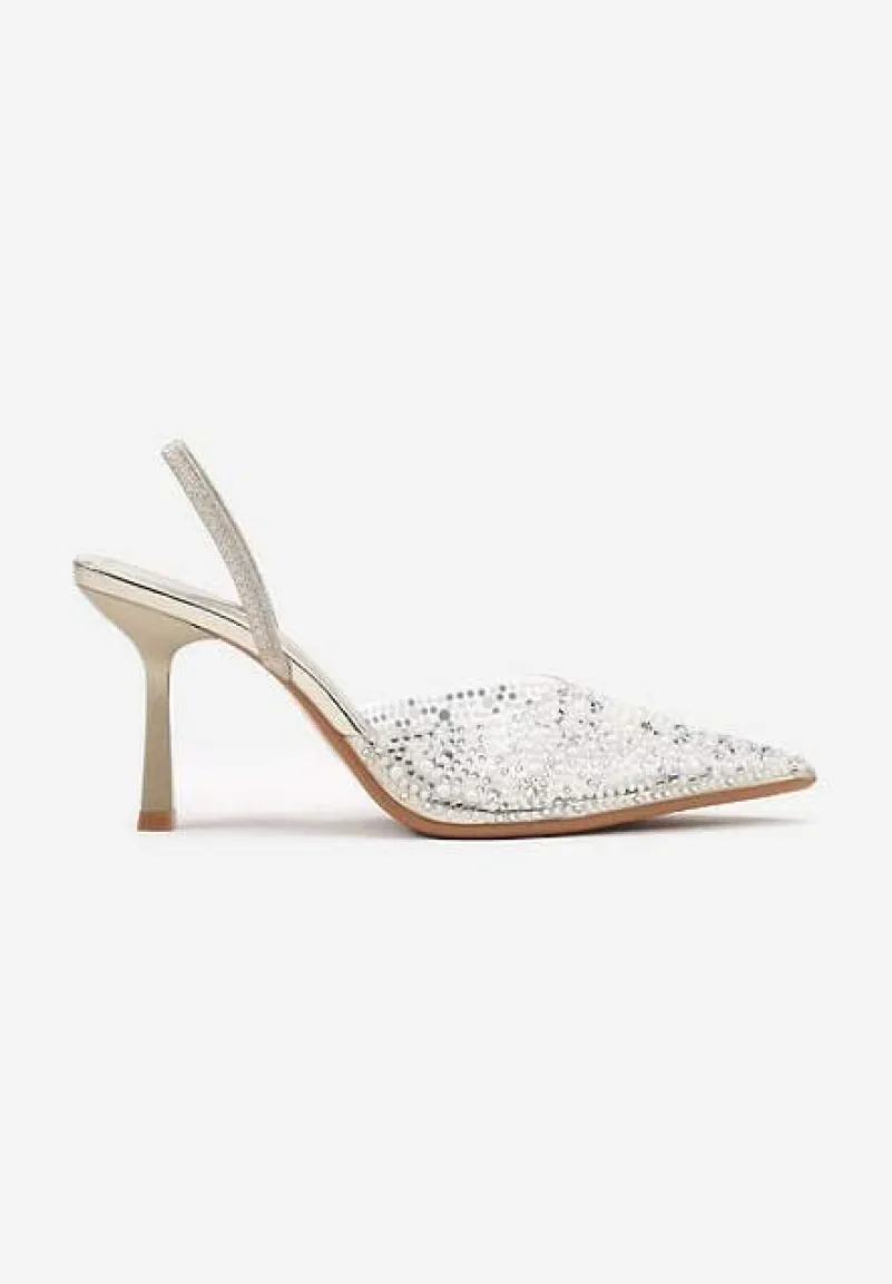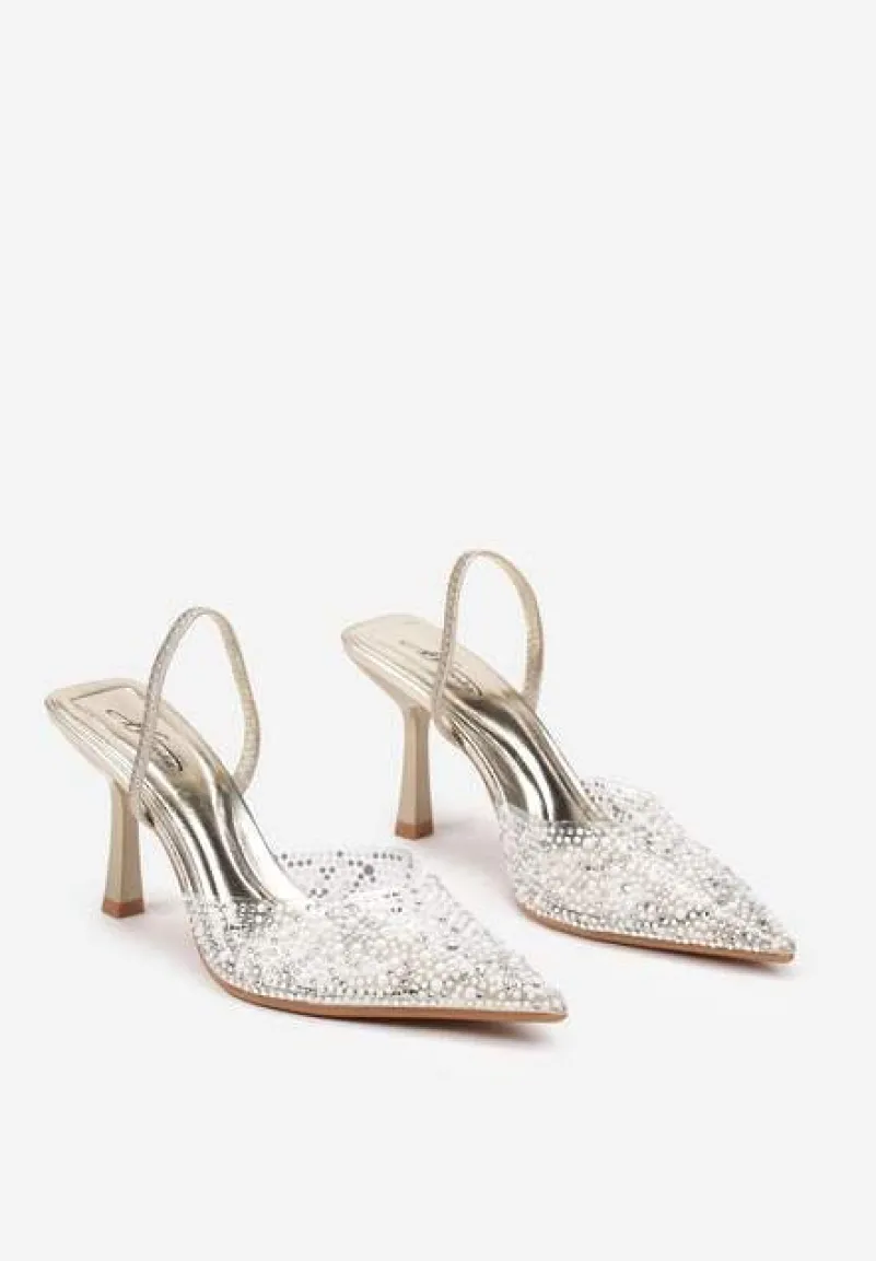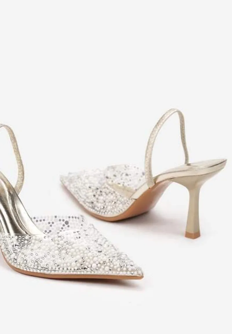 Złote Sandały Transparentne z Cyrkoniami na Niskiej Szpilce Leritta
