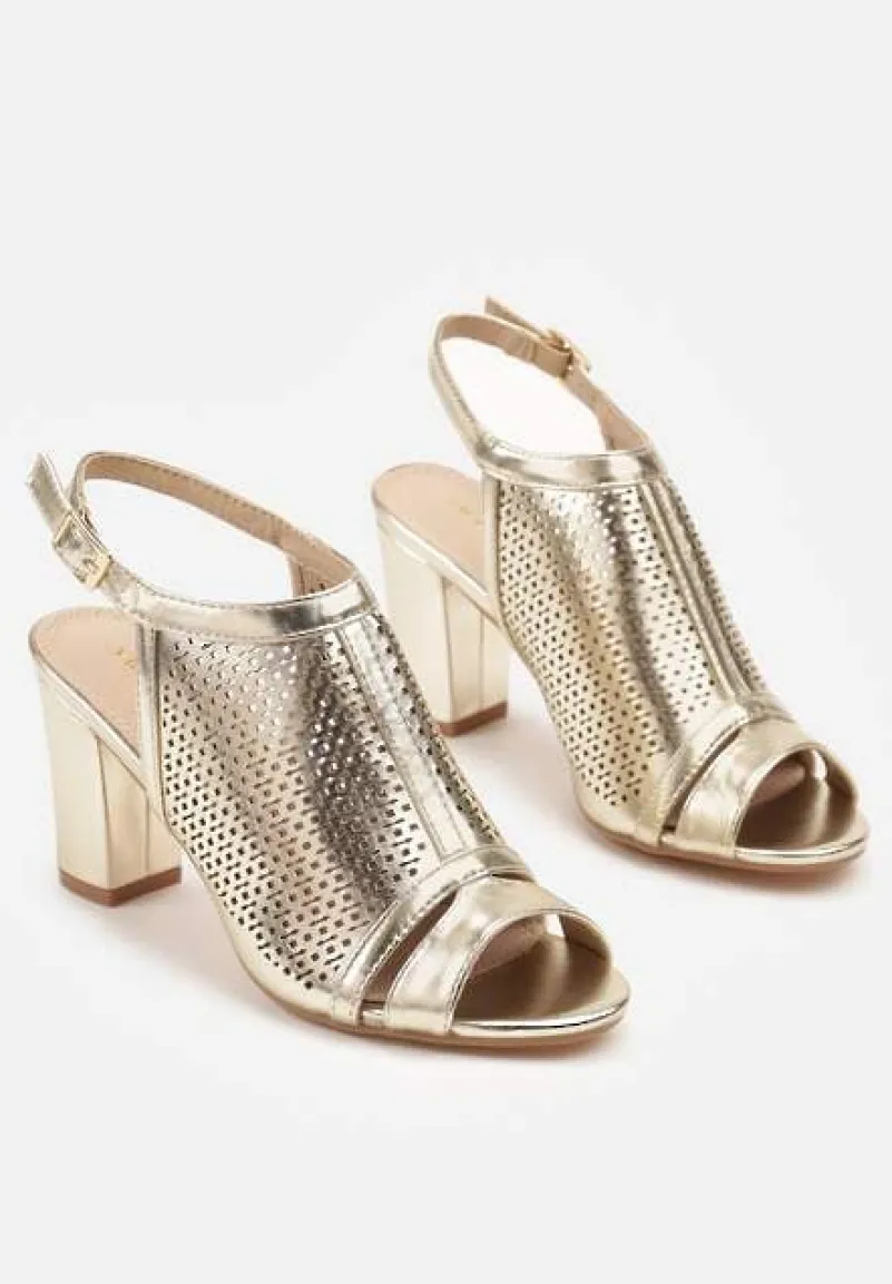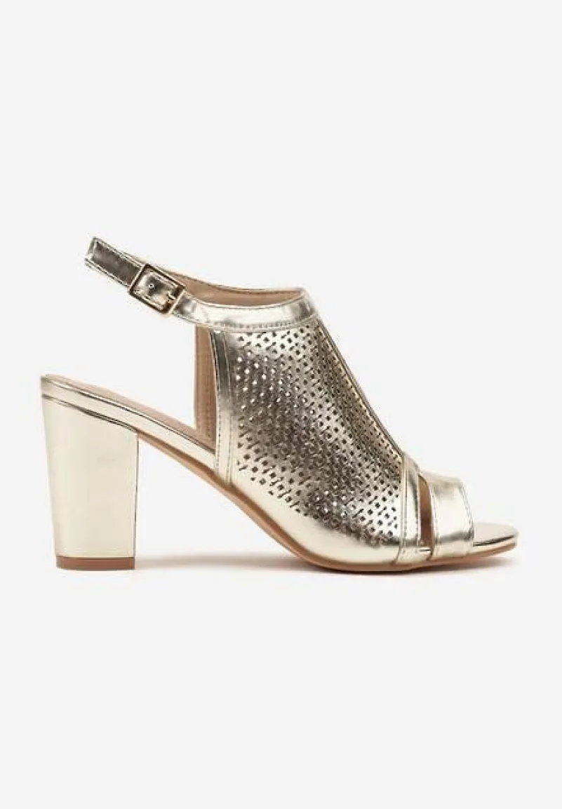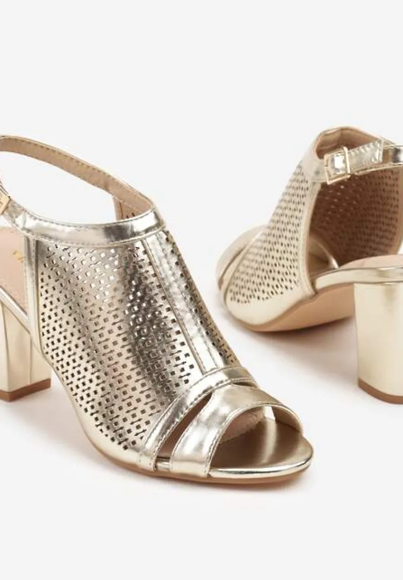 Złote Sandały Vices na Słupku z Ażurową Cholewką i Skórzaną Wkładką Saramiae