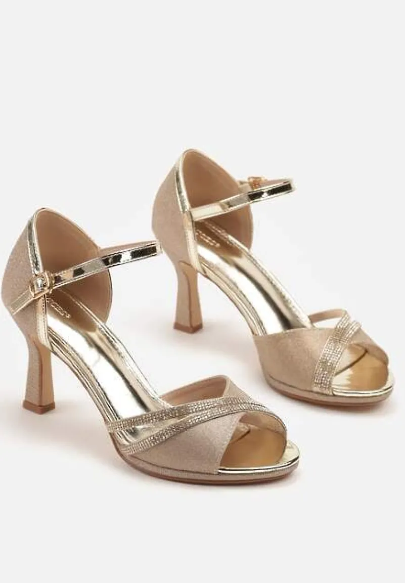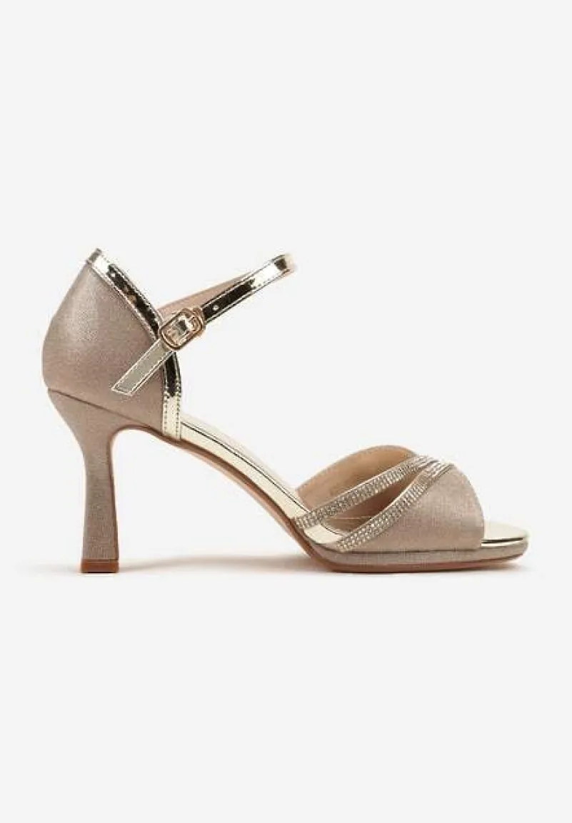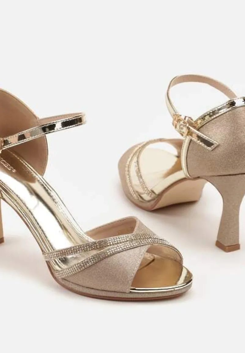 Złote Sandały Vices na Szpilce Ozdobione Cyrkoniami i Brokatem Oviasse