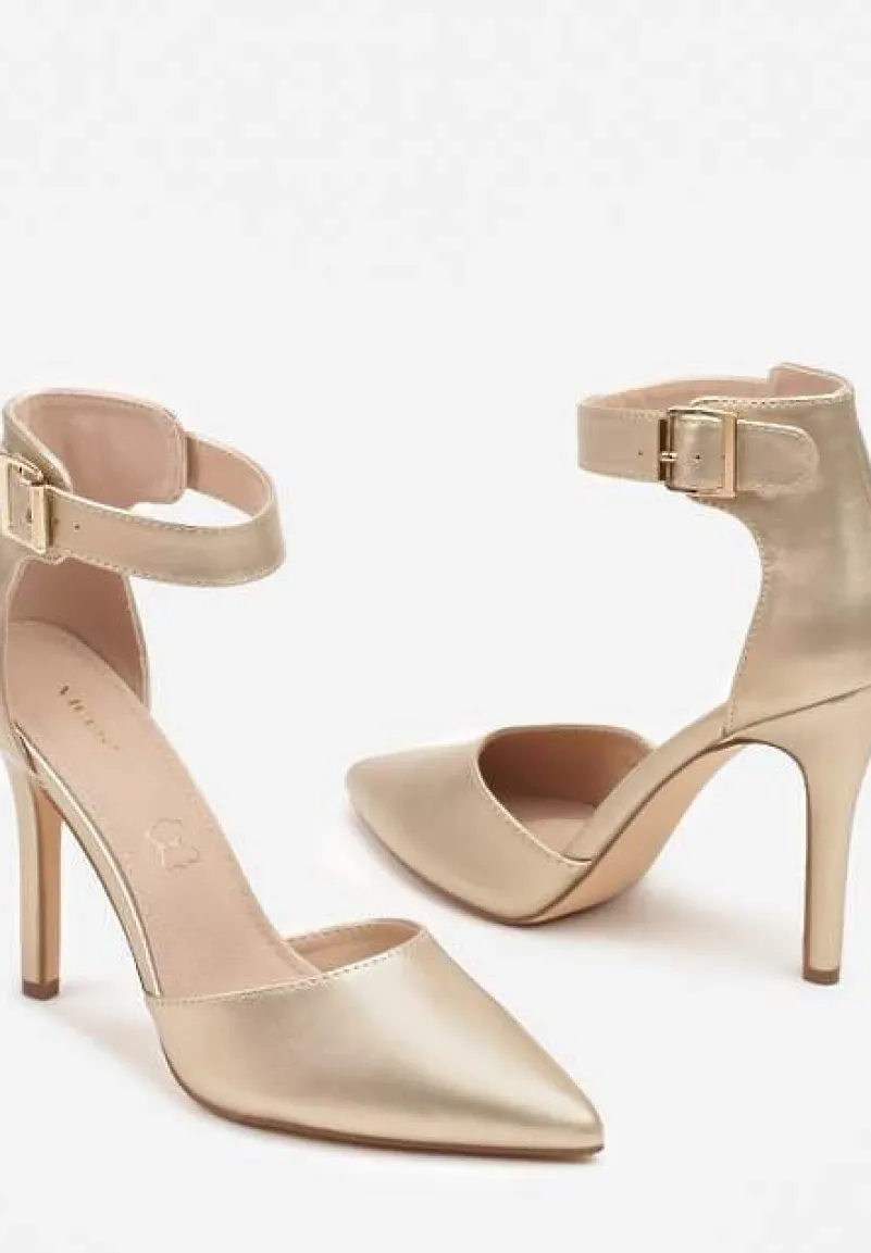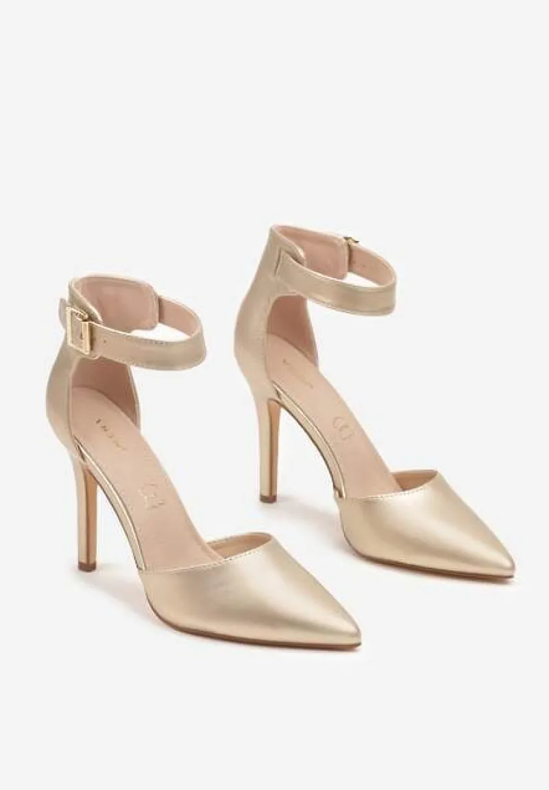 Złote Szpilki Vices z Wkładką ze Skóry Naturalnej Ozdobione Sprzączką Greliri