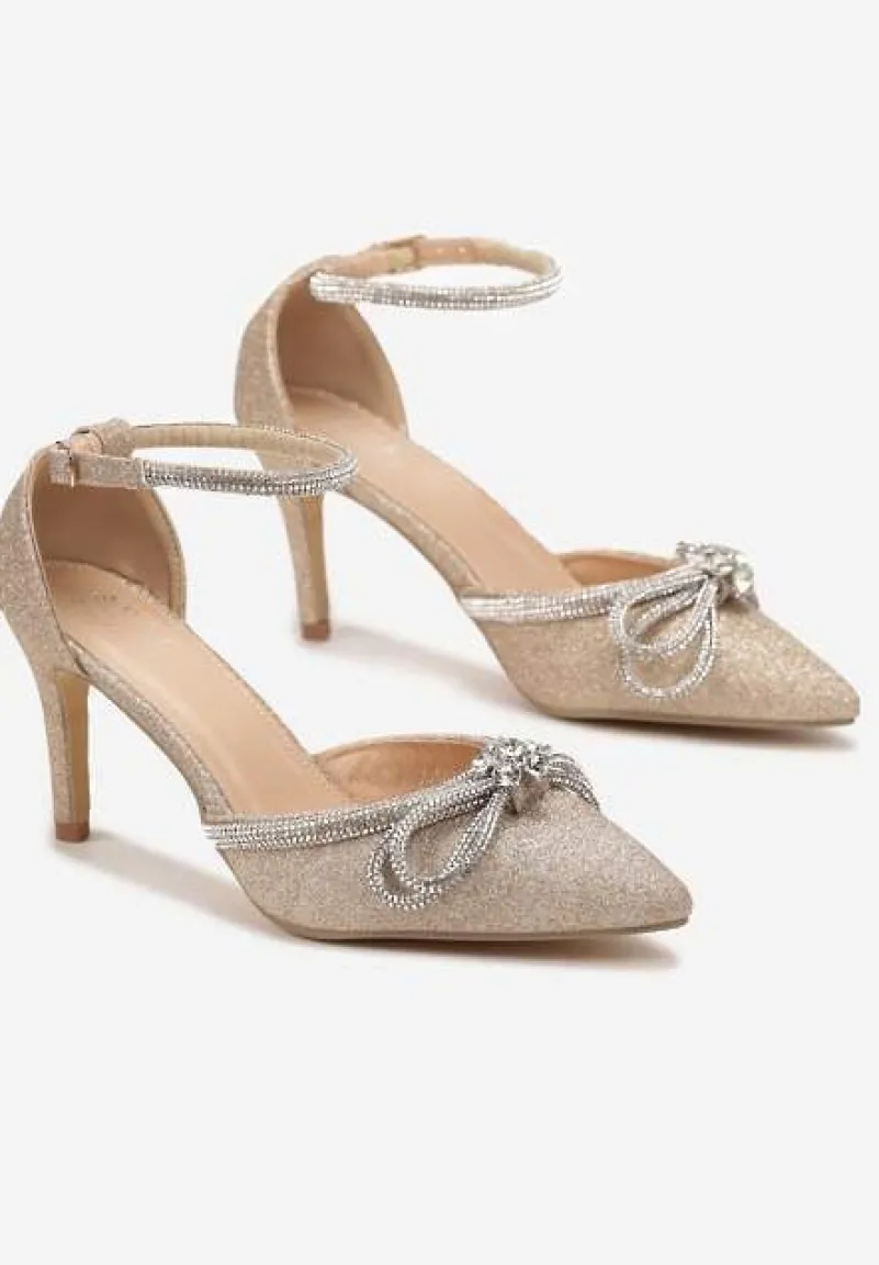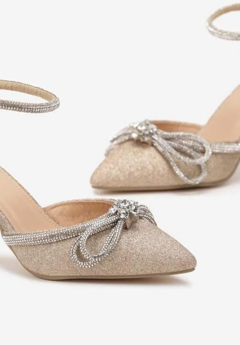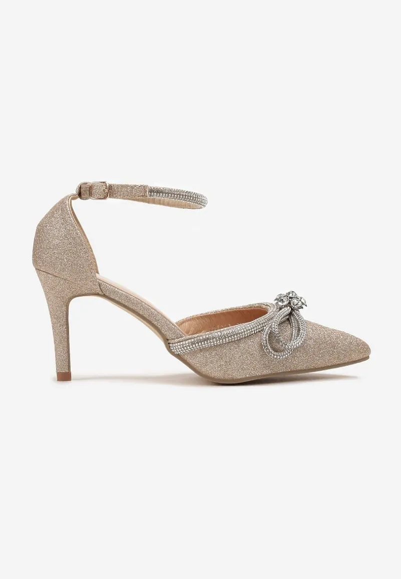 Złote Szpilki z Ekoskóry na Szpilce Ozdobione Kokardą i Cyrkoniami Dovanda