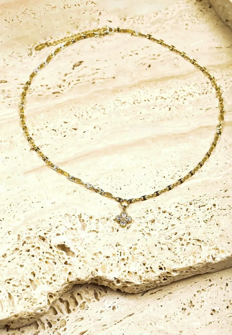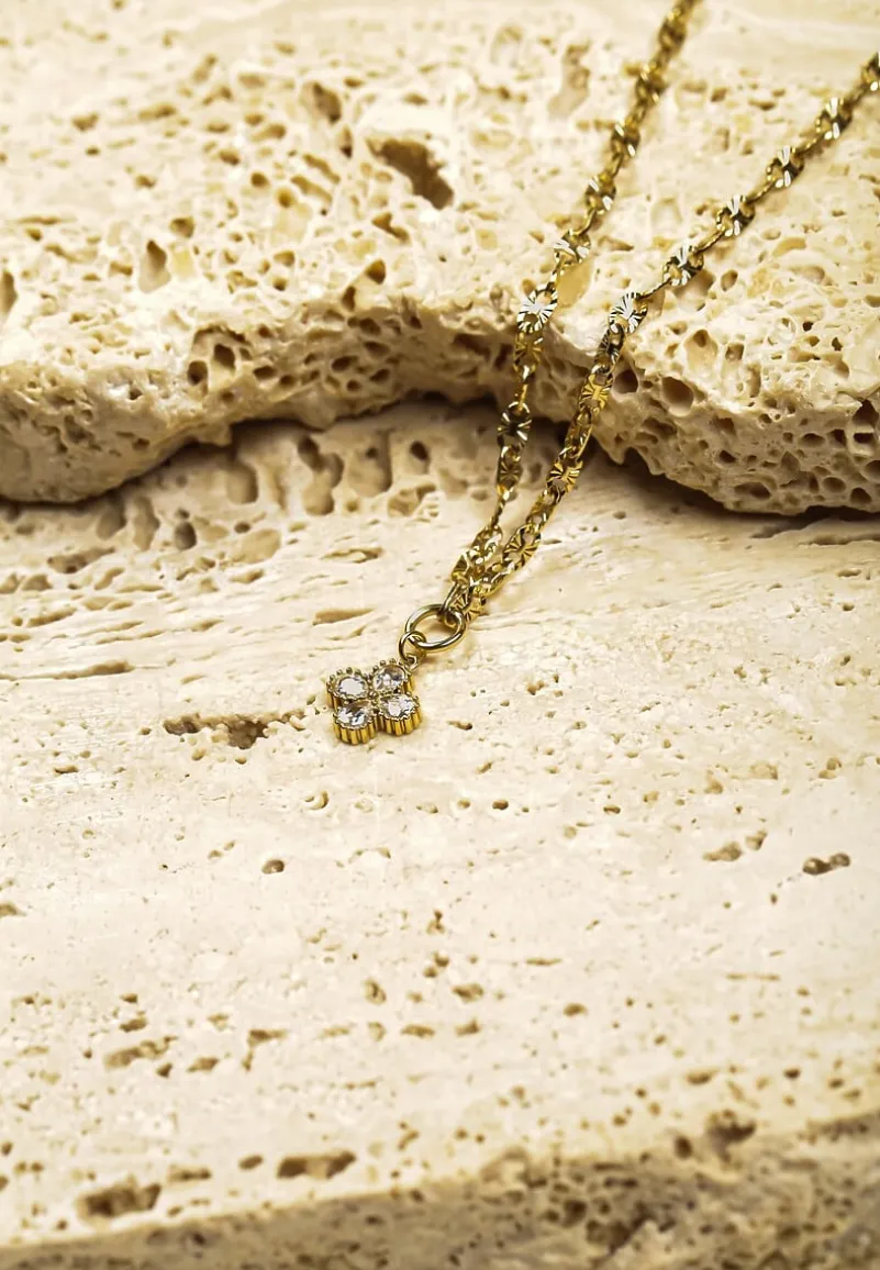 Naszyjnik z Błyszczącą Zawieszką Koniczynką i Cyrkoniami Firazia to doskonały dodatek, który przyciągnie spojrzenia i doda blasku każdej stylizacji. Wykonany ze stali nierdzewnej, jest trwały i idealnie dopasowuje się do dekoltu, podkreślając kobiecą urodę. Ten elegancki akcent świetnie sprawdzi się zarówno w codziennych zestawach, na przykład z białą bluzką i jeansami, jak i w szykownych stylizacjach na wieczorne wyjścia, gdy zestawisz go z elegancką sukienką i szpilkami. Naszyjnik zapina się na karabińczyk z przedłużką.