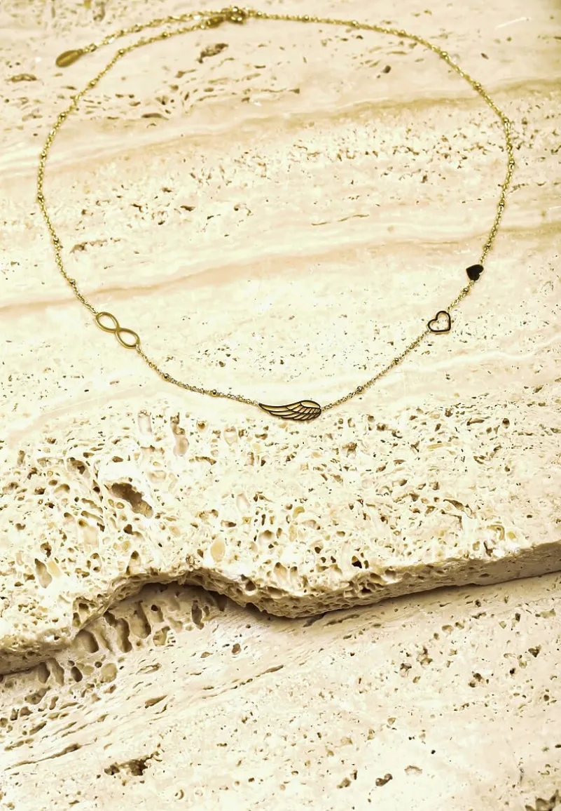 Naszyjnik z Ozdobnym Sercem, Skrzydłem i Nieskończonością Turese to must-have w kolekcji każdej fashionistki! Jego urokliwe detale idealnie wpasują się w stylizacje na co dzień, jak i na bardziej eleganckie wyjścia. Delikatny, ale z wyrazistym akcentem, doda charakteru prostej bluzce i jeansom na lunch z przyjaciółkami lub stanie się perfekcyjnym dopełnieniem sukienki na wieczornym przyjęciu. Wykonany ze stali nierdzewnej.