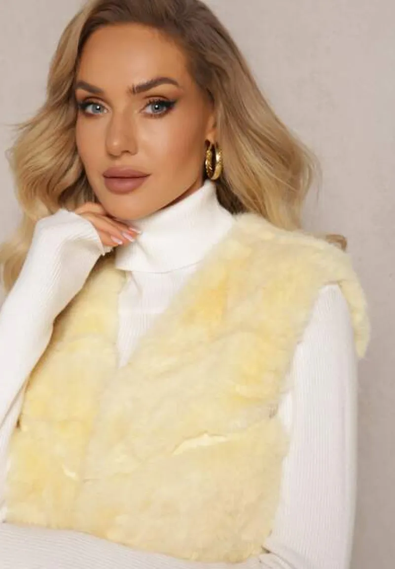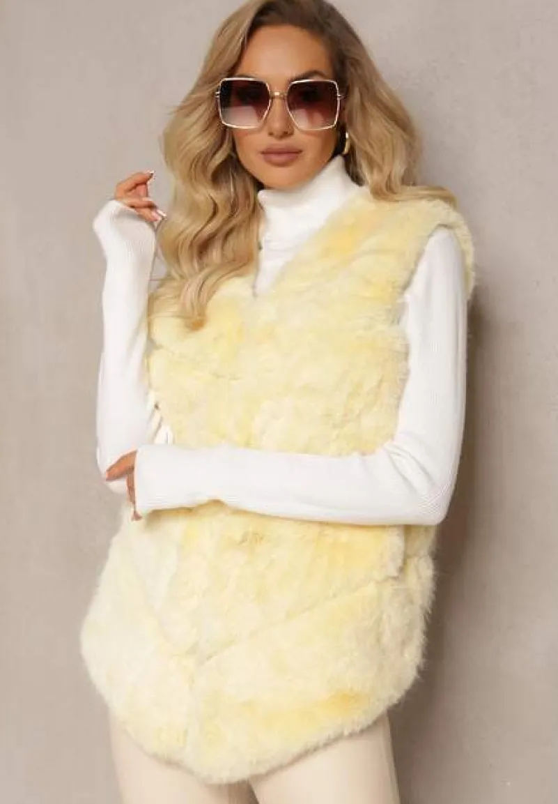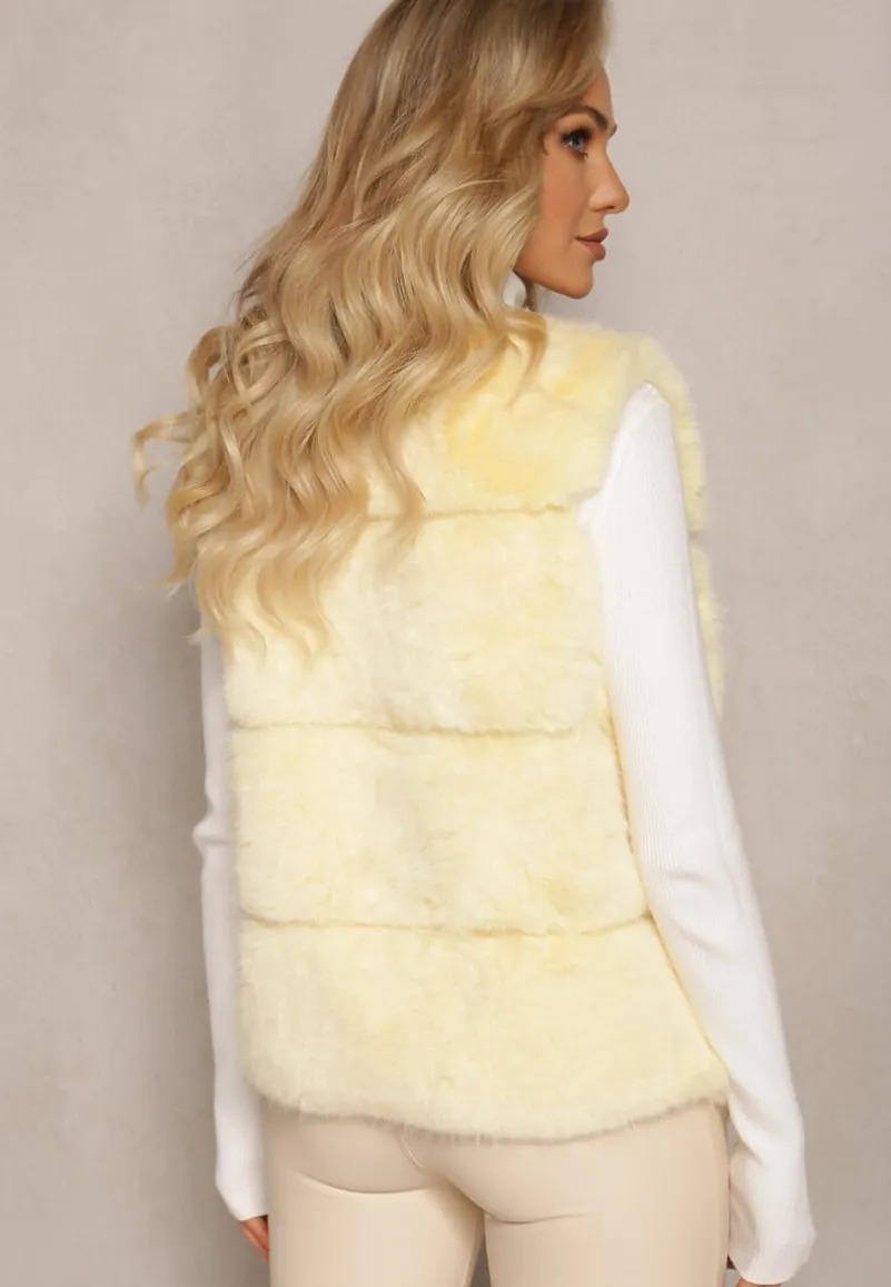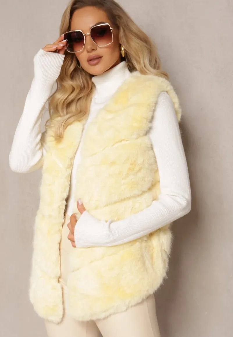 Kamizelka Iraau zdobiona ozdobnym, miłym w dotyku futerkiem. Zapinana z przodu na haftki. Na wysokości pasa wsuwane kieszenie.