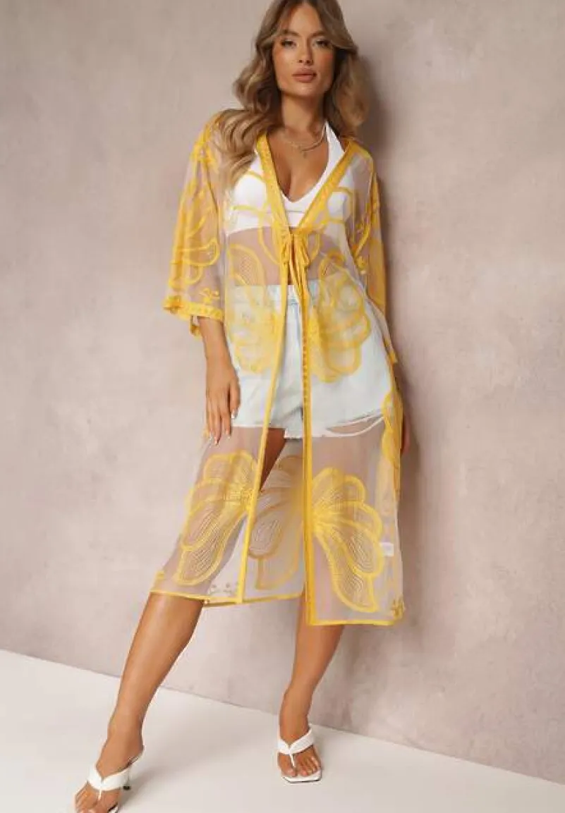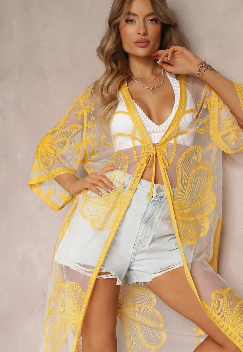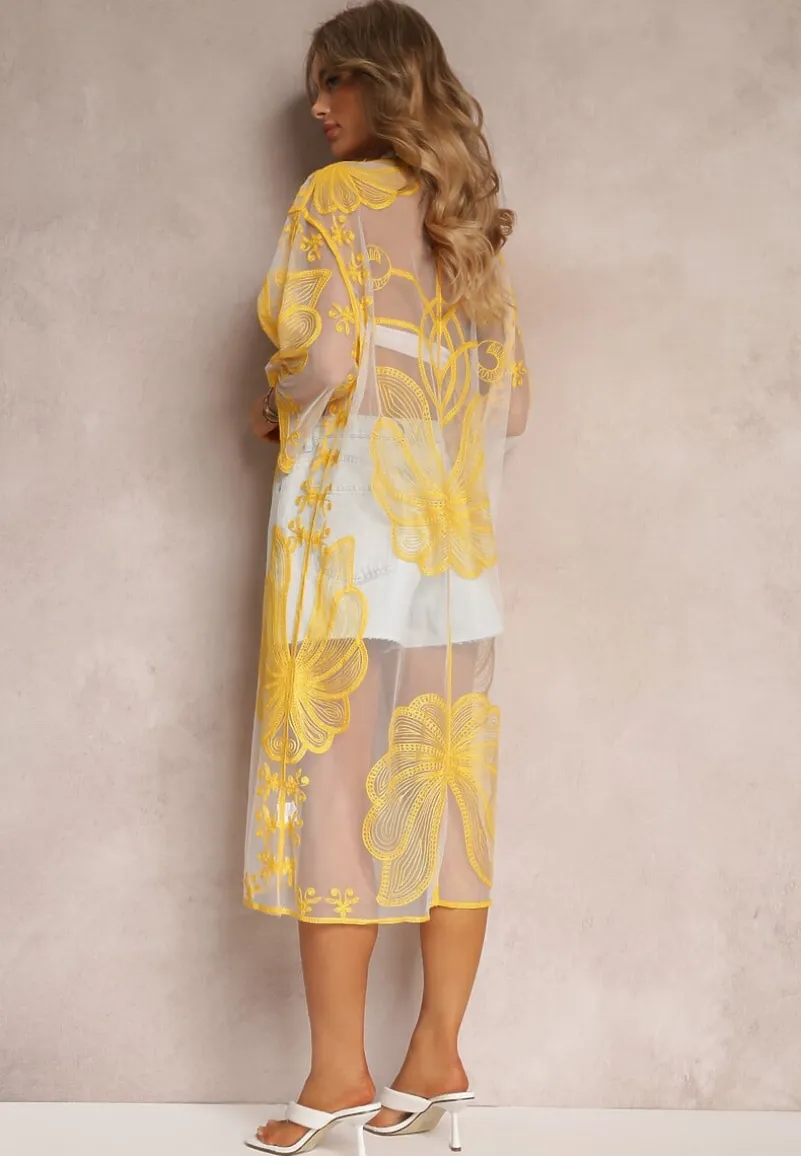 Przezroczysta narzuta Miri w haftowane kwiaty. Wykonana z transparentnej siateczki. Model z szerokimi rękawami. Ozdobna narzutka Miri idealna do stylizacji w stylu boho.