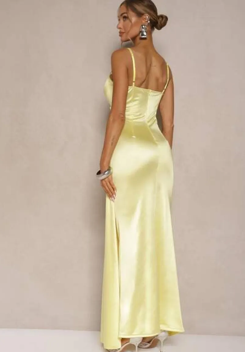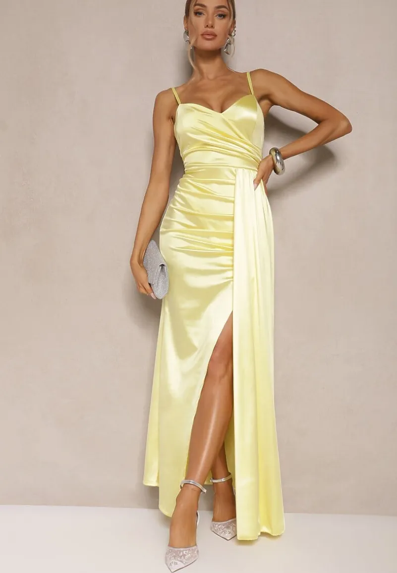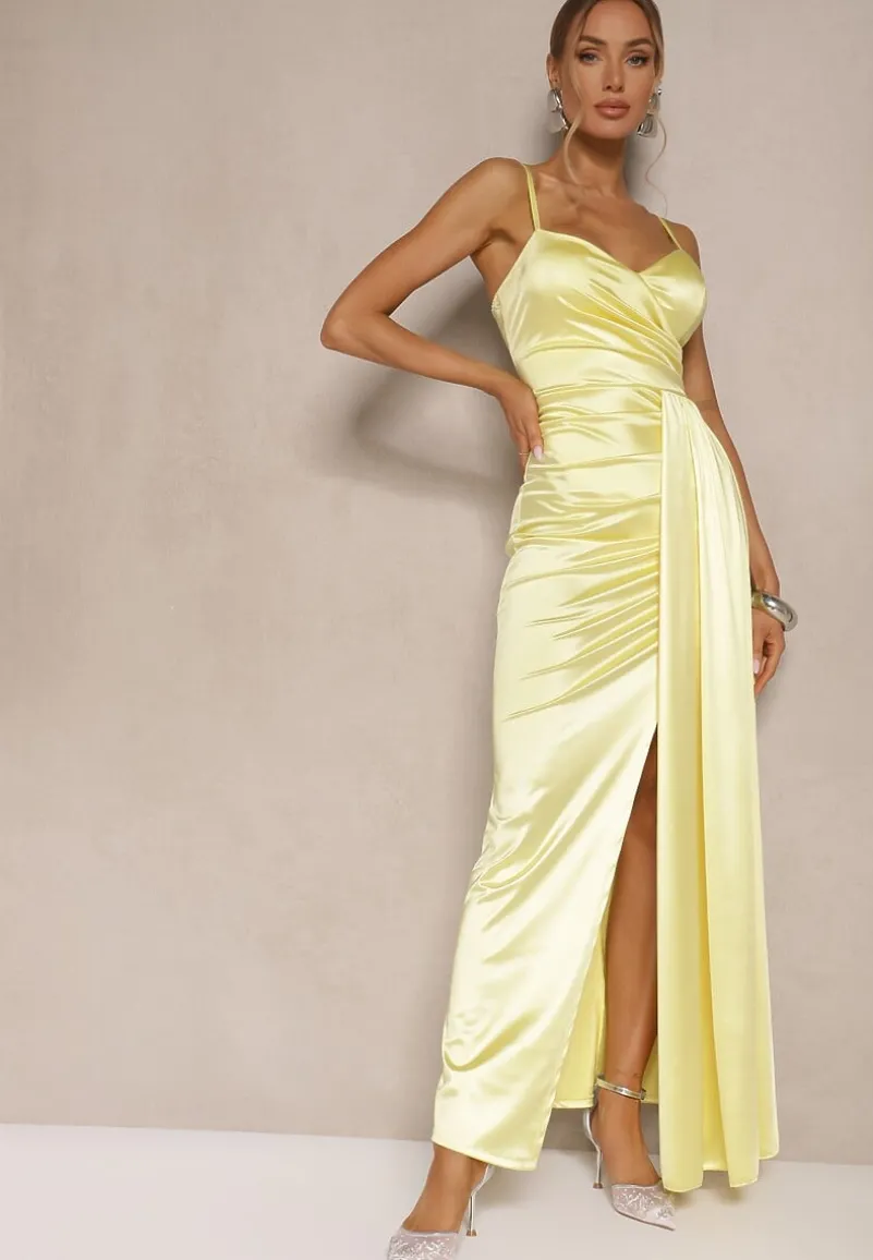 Żółta Sukienka Satynowa z Marszczeniem i Ozdobnym Trenem Katiriva