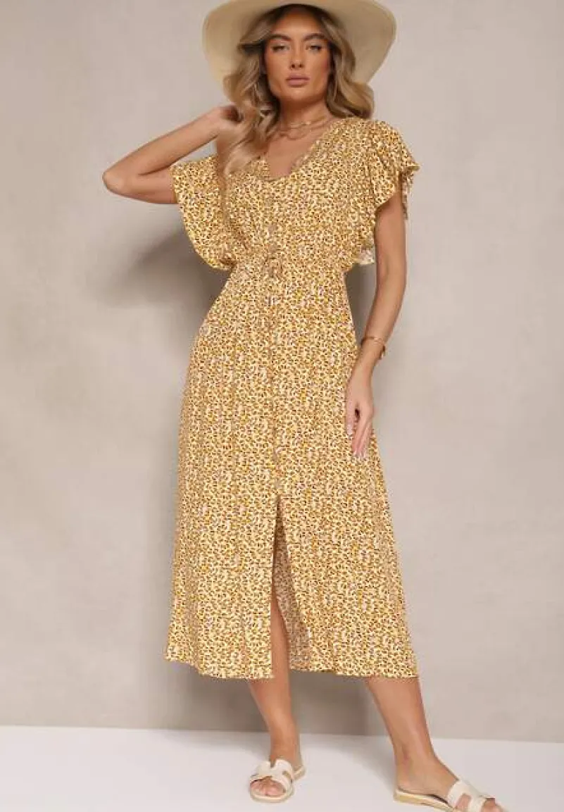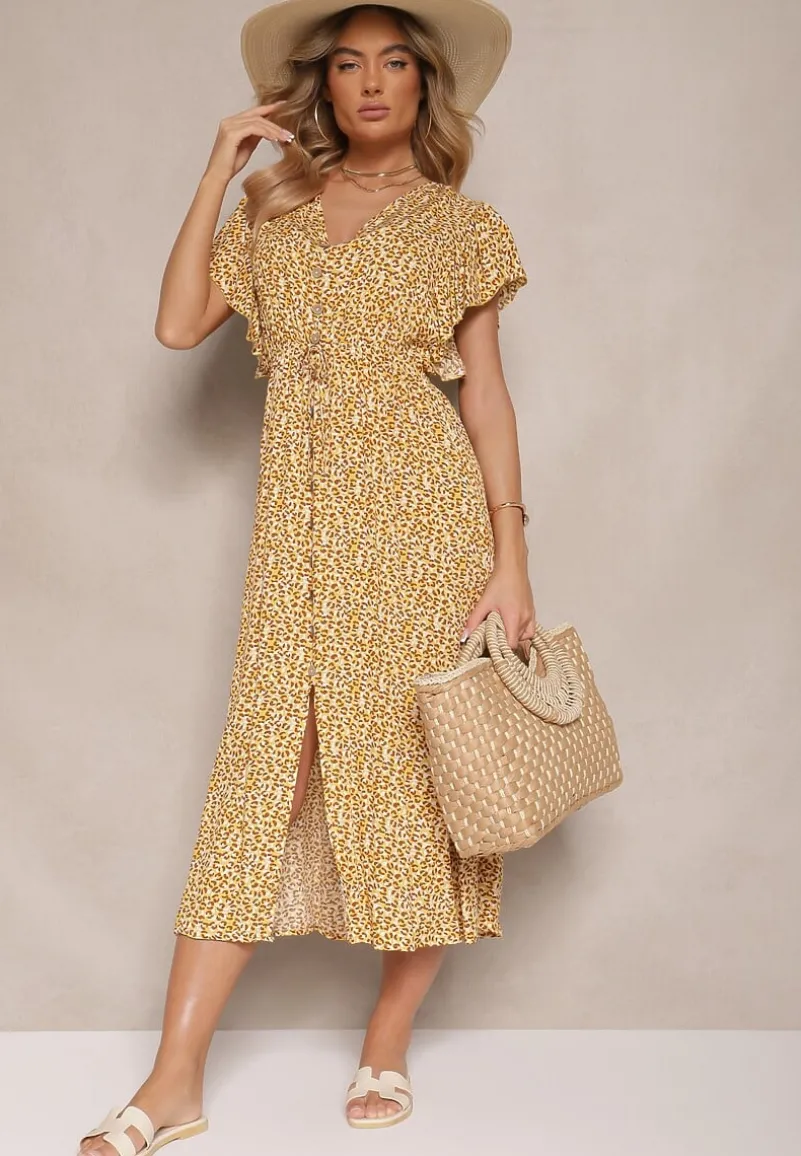 Sukienka Aluvellae o rozkloszowanym kroju zdobiona guzikami to idealne połączenie swobodnej elegancji i nowoczesności. Dekolt w kształcie litery V subtelnie podkreśla szyję, a krótkie rękawy dodają lekkości i komfortu noszenia. Wzór w cętki nadaje jej niepowtarzalnego charakteru, czyniąc ją idealnym wyborem na letnie spacery czy romantyczne kolacje. Stylizuj ją na co dzień z sandałami i plecioną torebką, a na formalne okazje zestaw ze szpilkami i minimalistyczną biżuterią. Sukienka posiada elastyczną gumkę w talii, która rozciąga się do 93 cm (M/L) i 97 cm (L/XL). Brak podszewki.