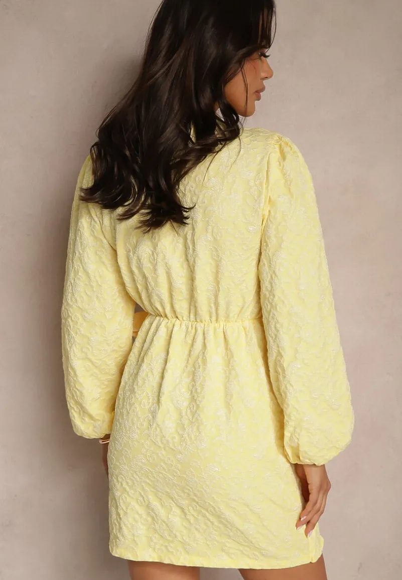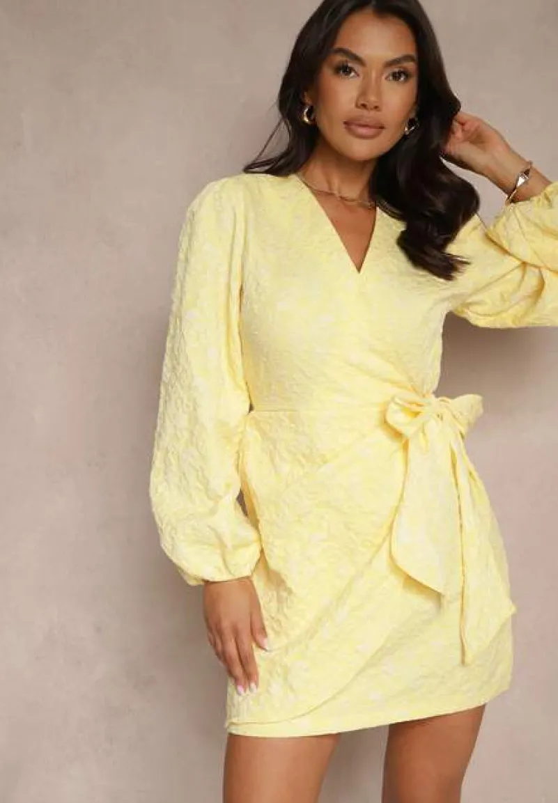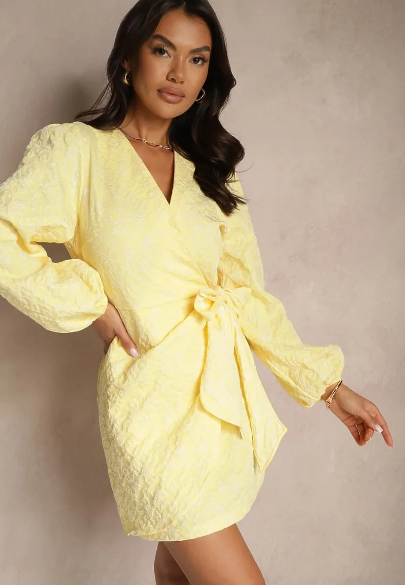 Żółta Taliowana Sukienka o Kopertowym Fasonie Fadasse