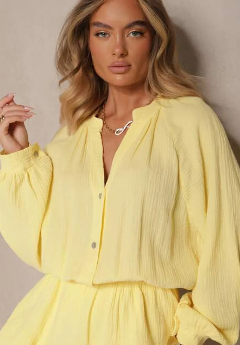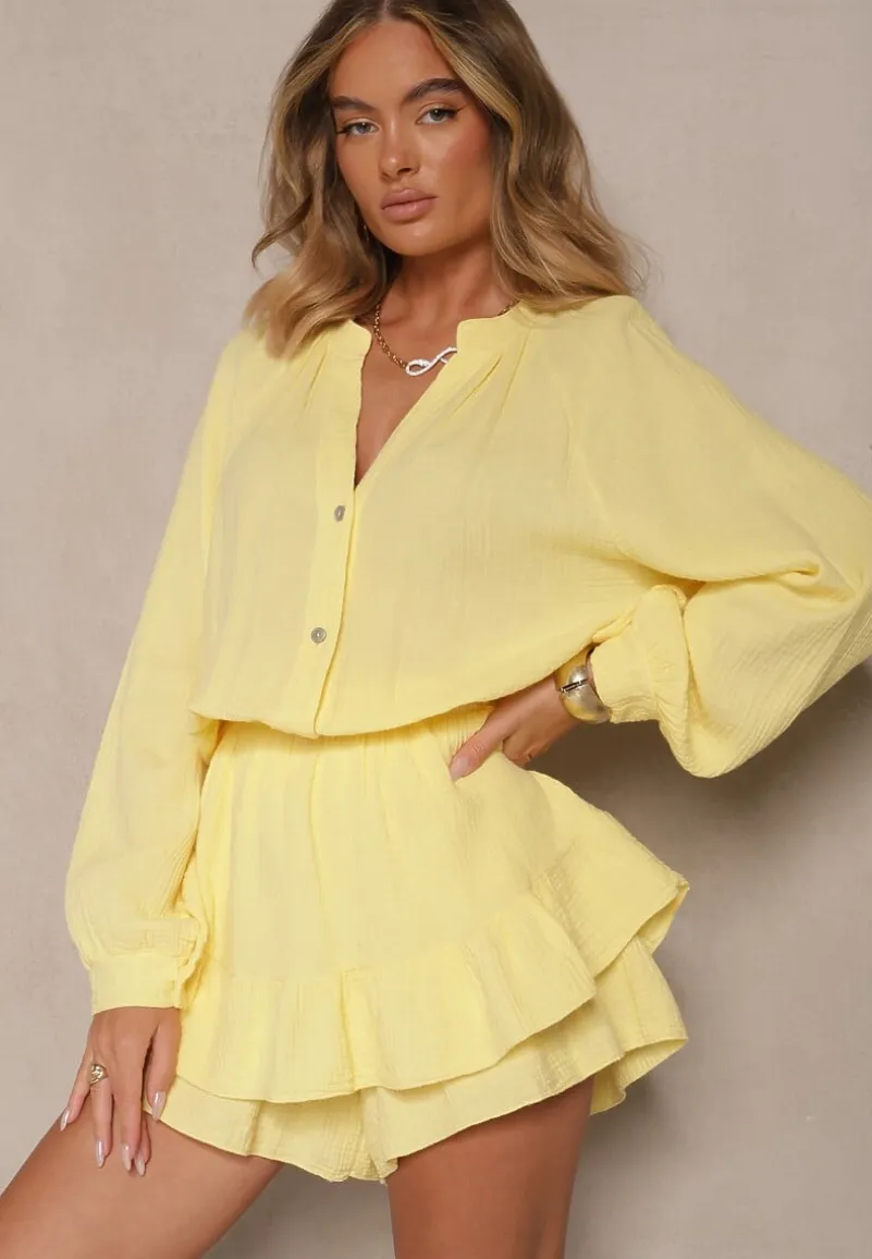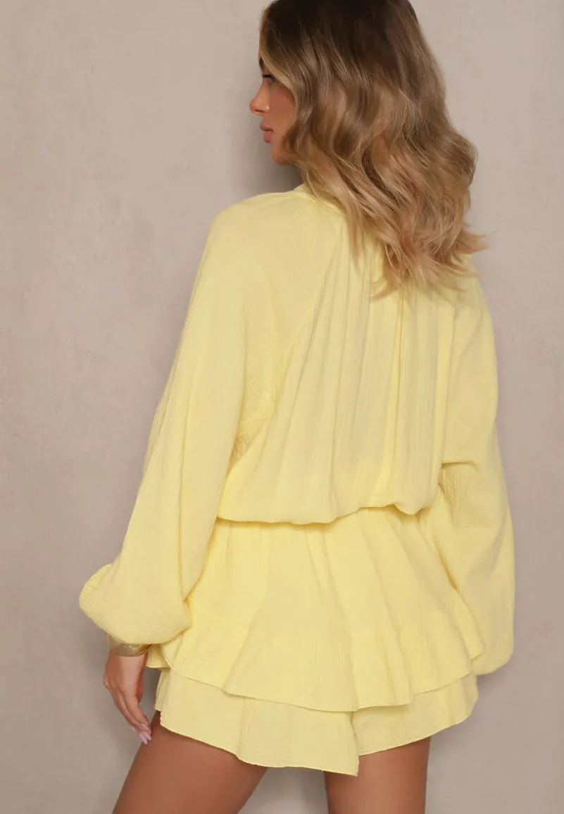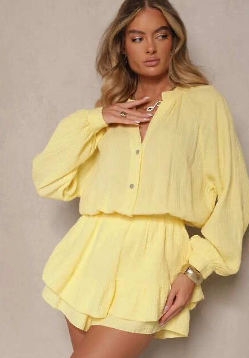 Żółty Kombinezon z Bawełny ze Spódnico-Spodenkami i Guzikami oraz Gumką w Talii Vimatthea