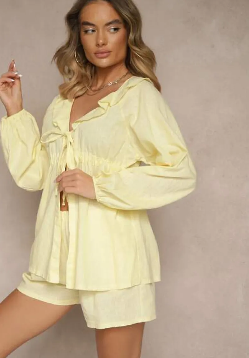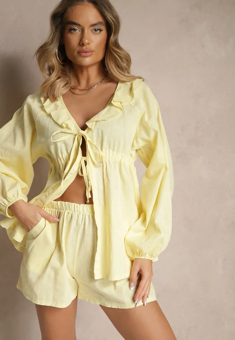 Odkryj wyjątkowy komplet Mirovenia! Zestaw ten wyróżnia się modnym krojem i delikatnymi zdobieniami, które zapewnią stylowy wygląd w każdej sytuacji. Bluzka z wiązaniem i falbanką doskonale podkreśla sylwetkę, a szorty o luźnym fasonie z gumką w talii i wsuwanymi kieszeniami zapewniają komfort noszenia. Komplet Mirovenia idealnie sprawdzi się zarówno na co dzień z trampkami i plecakiem, jak i na wieczorne wyjście z przyjaciółmi w połączeniu z eleganckimi sandałami i biżuterią. Musisz go mieć!